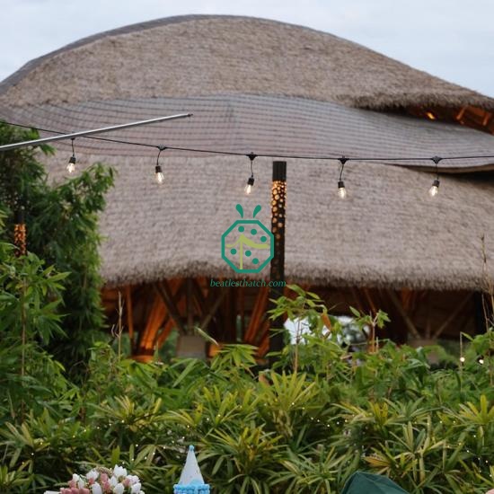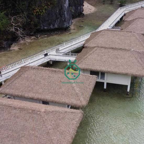 สำหรับตกแต่งหลังคามุงจากบ้านพักเหนือน้ำ กระเบื้องมุงหลังคาไนลอน เป็นโซลูชันที่คุ้มค่ามาก กระเบื้องมุงจากไนลอนมีความทนทานสูงสำหรับการใช้งานบริเวณชายหาดเนื่องจากโครงสร้างทางเคมี หลังคามุงจากไนลอนสำหรับบังกะโลมีลักษณะนุ่มฟู ซึ่งจะดึงดูดความสนใจของลูกค้าให้มาพักที่โรงแรมรีสอร์ทของคุณเป็นอย่างมาก ในขณะเดียวกัน แผ่นมุงจากไนลอนมีความปลอดภัยสำหรับเรามากกว่าวัสดุมุงจากธรรมชาติ เนื่องจากมุงจากไนลอนสามารถผ่านมาตรฐาน V0 สำหรับดัชนีส่วนใหญ่ภายใต้มาตรฐานการทดสอบการทนไฟ UL 94-2013 เมื่อพิจารณาถึงประโยชน์ของหลังคามุงจากไนลอนข้างต้นแล้ว หลังคามุงจากไนลอนจึงคุ้มค่าสำหรับการใช้งานในการออกแบบหลังคามุงจากสำหรับบังกะโลรีสอร์ทโรงแรม